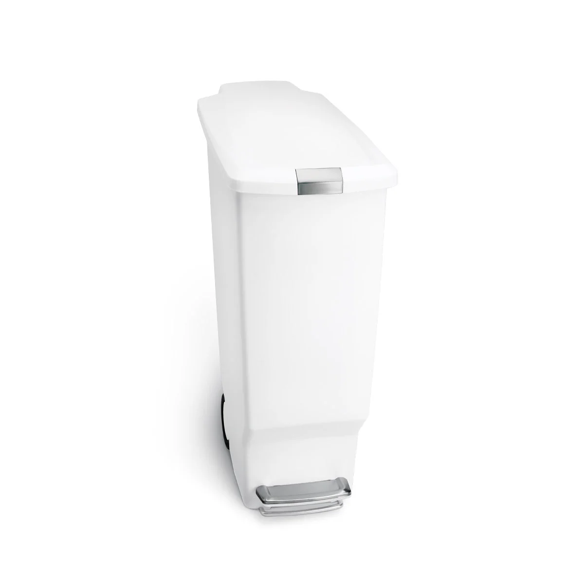 Our slim plastic pedal bin has a space-efficient shape that fits perfectly in tight spaces, like between cupboards. The strong steel pedal is designed to last, and our patented lid shox technology ensures a smooth, silent close every time. A slide lock helps keep rubbish in and pets and curious children out. Try our custom fit liner for this bin — extra strong and a perfect fit.